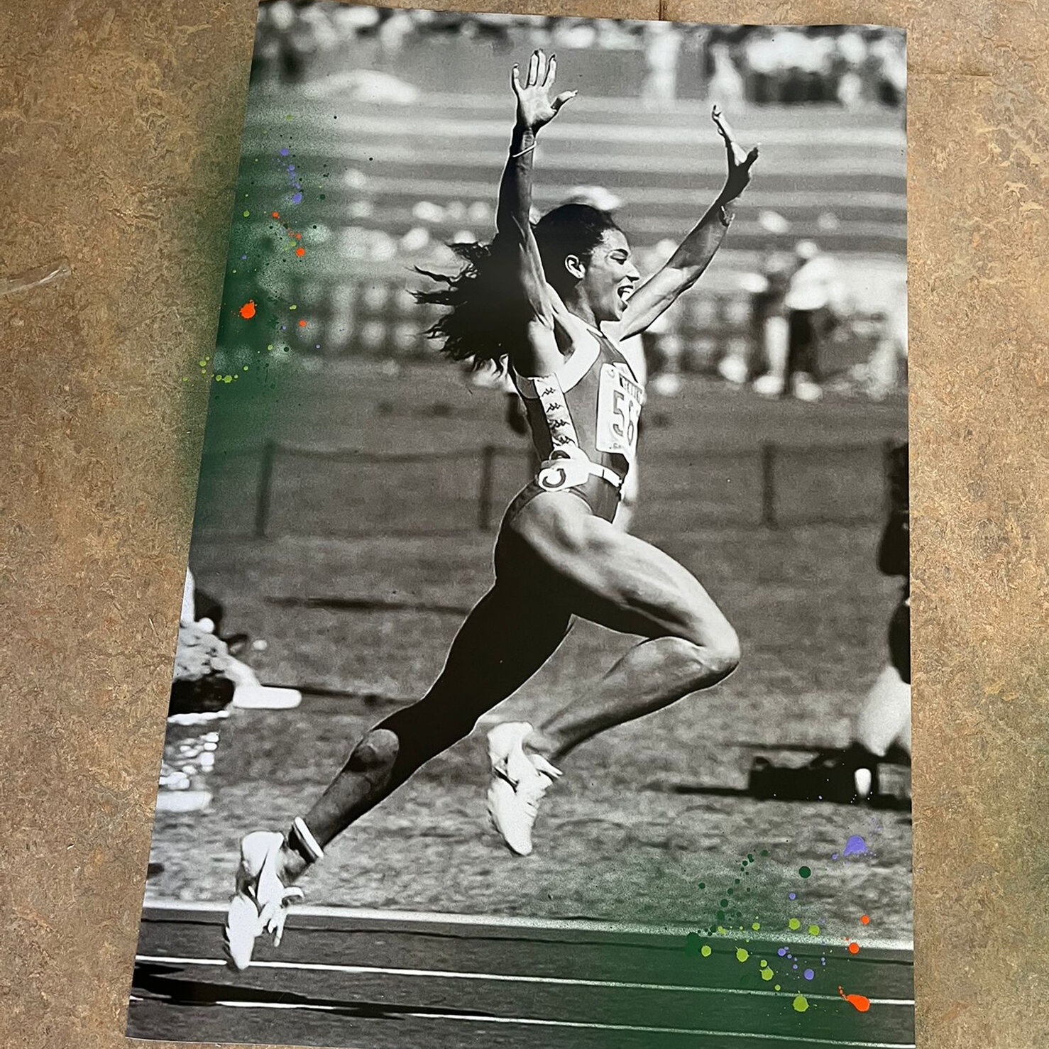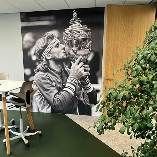 Van vloer tot plafond schittert een monumentale foto van Björn Borg. Een iconisch moment waarin hij de beker kust. Daar tegenover hangen krachtige portretten van Florence Griffith Joyner, Muhammad Ali en Michael Jordan. Deze iconen zijn door ons verrijkt met kleurrijke graffiti-elementen in Univé’s huisstijl, wat zorgt voor een unieke mix van energie en inspiratie.