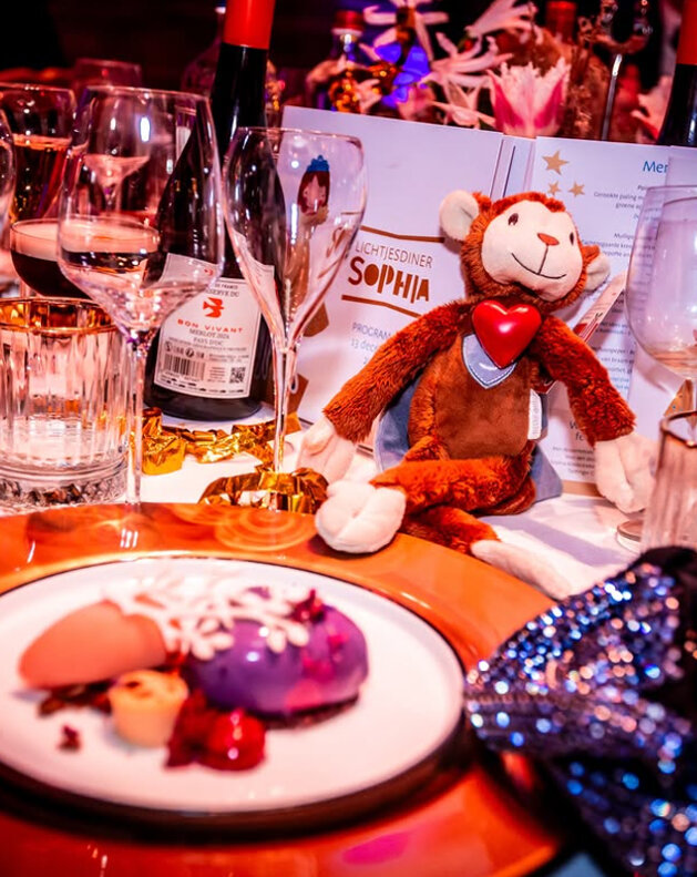Voor het Sophia Lichtjesdiner kreeg GINVI de bijzondere vraag om een uniek veilingitem te creëren. Als basis diende de iconische knuffel, "het super aapje" die alle kinderen in het Sophia Kinderziekenhuis ontvangen. Vanuit die gedachte ontwikkelde Frank met Anne Pien dit exclusieve kunstbeeldje.