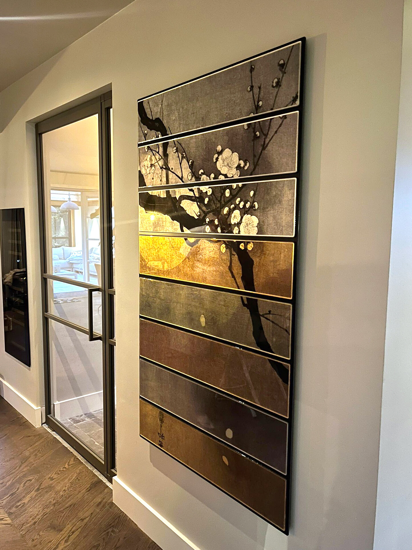 Dit luxe kunstwerk is geïnspireerd door de beroemde Ohara Koson. Bij Ginvi hebben we dit werk op unieke wijze vertaald in moderne stroken, waarbij elke strook met de hand werd belegd met bladgoud of bladzilver, verrijkt met zachte tinten inkten en meerdere lagen epoxy voor een buitengewoon luxe uitstraling.