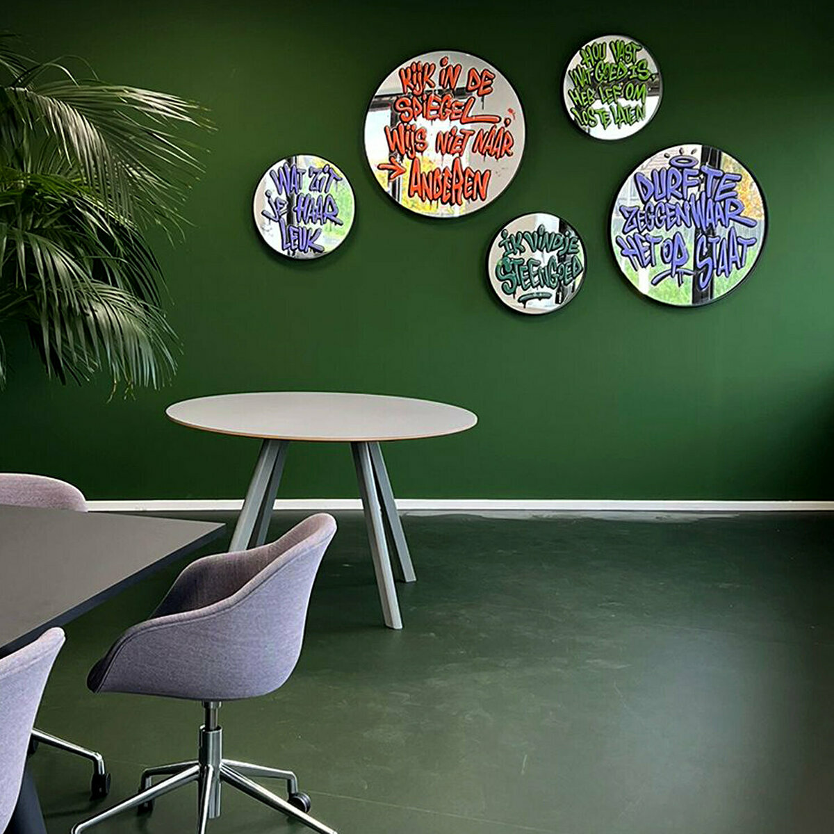 Opvallende spiegels Op een diepe donkergroene muur hangen vijf spiegels in verschillende afmetingen, elk voorzien van graffiti quotes in de kenmerkende Univé-kleuren. Functioneel én artistiek, echte blikvangers in de ruimte.
