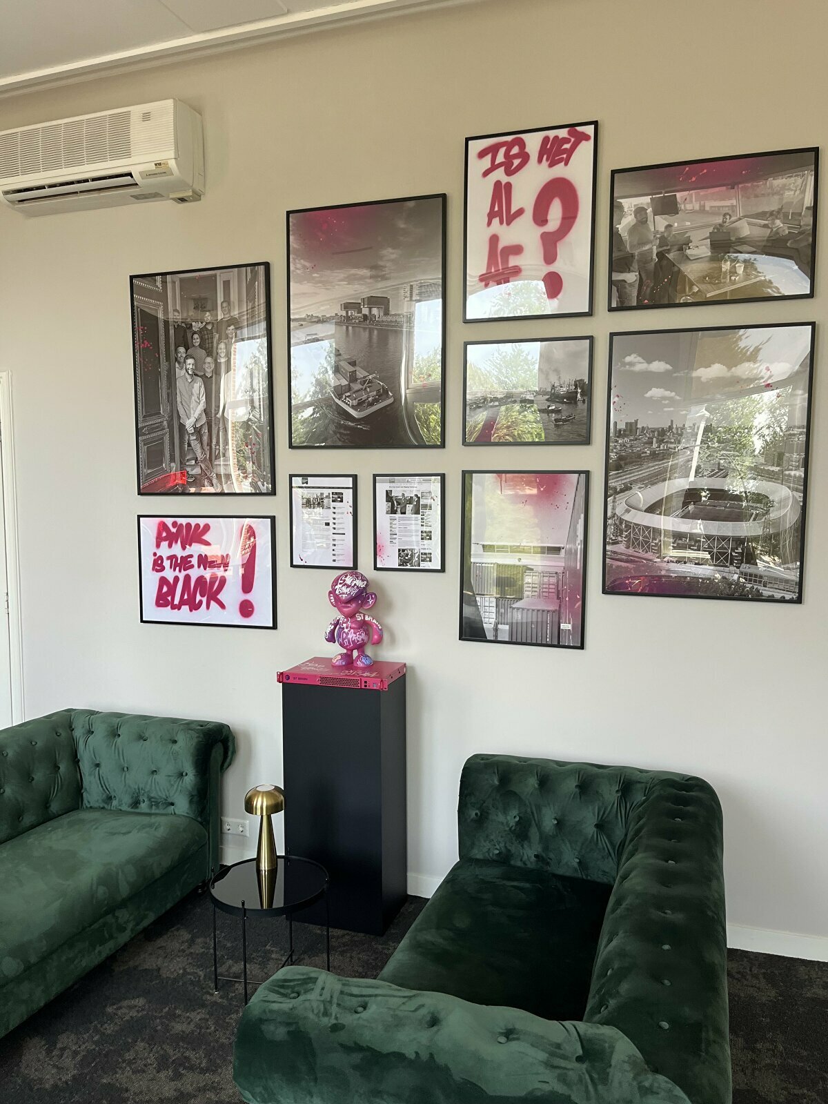 Het resultaat? Een kunstzinnige tijdlijn waar je blij van wordt, versterkt door hun eigen Binkie en een interieur dat klopt tot in de details met hun mooie groene velvet banken en fuchsia accenten.