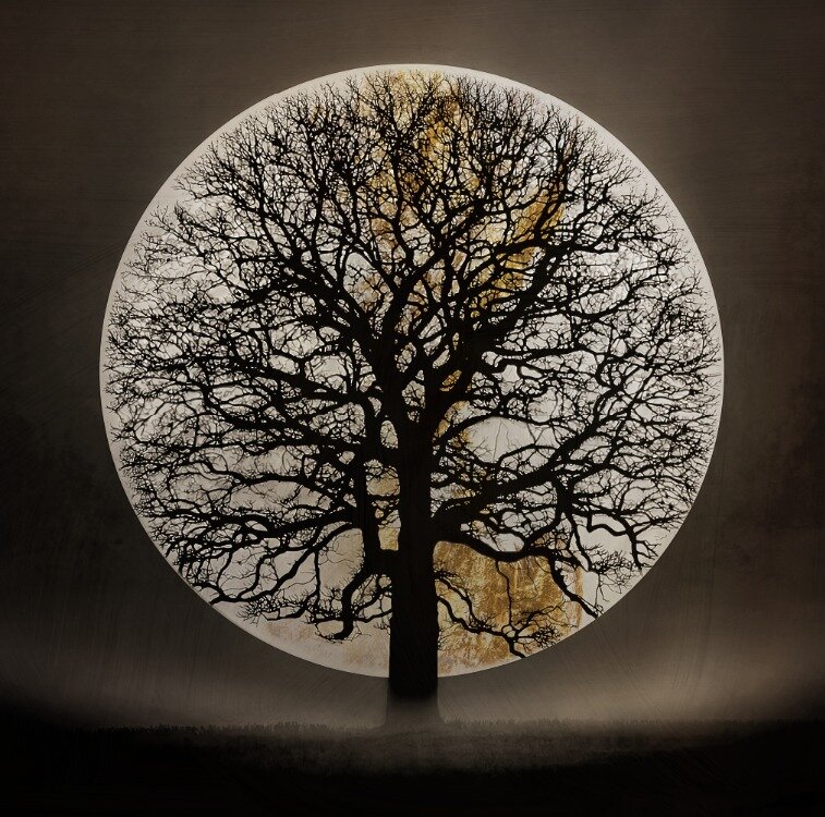 Strak en krachtig kunstwerk met een prachtige boom als eyecatcher. De fijne vertakkingen zorgen voor diepte en contrast tegen de zon, terwijl het bladgoud een warme, luxe uitstraling geeft.