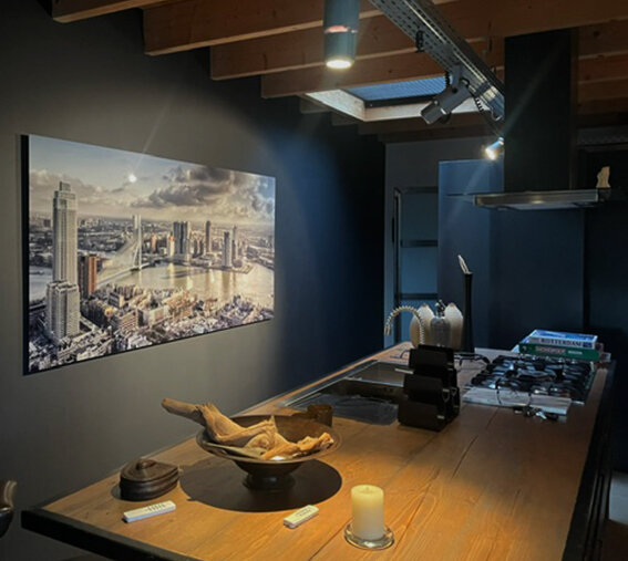 Achter de foto hebben we een 3mm dibond plaat gezet met daarop het aluminium ophangsysteem die samen voor extra stevigheid en dat het kunstwerk evenwijdig van de muur hangt! Weer een prachtig resultaat in groot formaat!