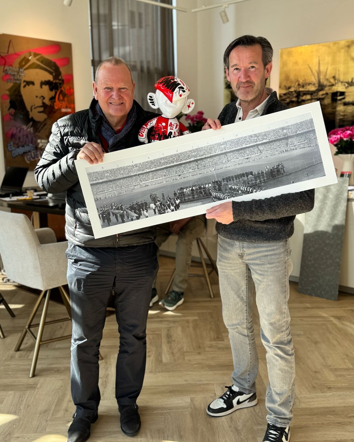 Precies vandaag ( De Kuip is vandaag 88 jaar geworden ) komt Jacq van Gorp met deze schitterende historische Kuip foto aan! Of wij er iets mee kunnen? Tuurlijk! Echt heel cool deze Kuip foto uit 1937 met reclamebord van van Gorp erop! We denken dat op deze foto, de eerste 1e interland wedstrijd was in de Kuip tegen België op 2 mei 1937. Fotograaf helaas onbekend. Natuurlijk moest Frank met Jacq en zijn Binkie in de clubkleuren op de foto! Mooie combi voor thuis bij Jacques van Gorp!