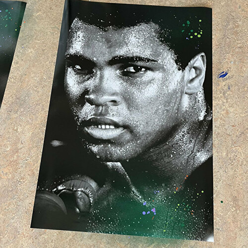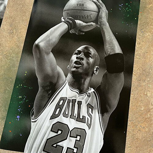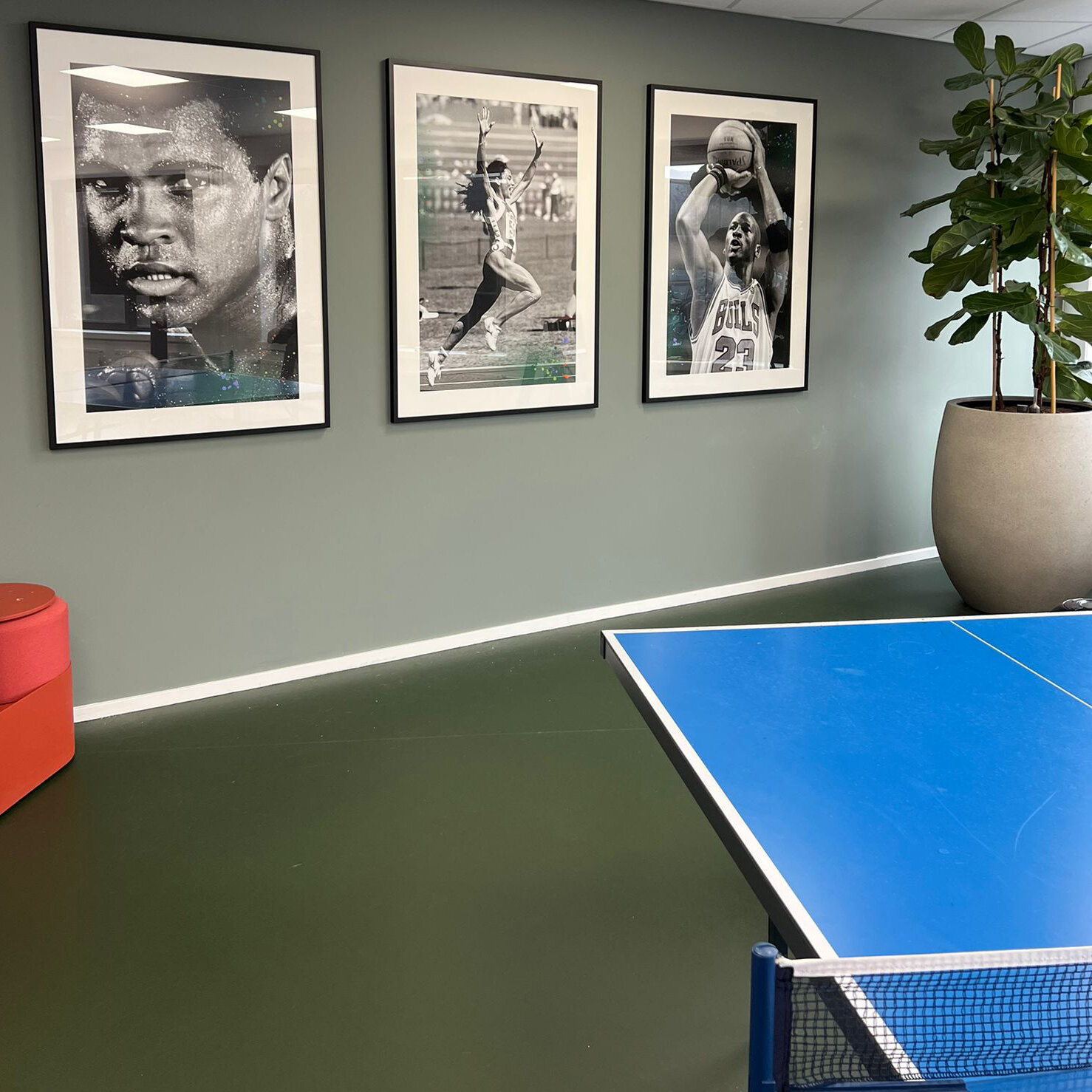 Van vloer tot plafond schittert een monumentale foto van Björn Borg. Een iconisch moment waarin hij de beker kust. Daar tegenover hangen krachtige portretten van Florence Griffith Joyner, Muhammad Ali en Michael Jordan. Deze iconen zijn door ons verrijkt met kleurrijke graffiti-elementen in Univé’s huisstijl, wat zorgt voor een unieke mix van energie en inspiratie.