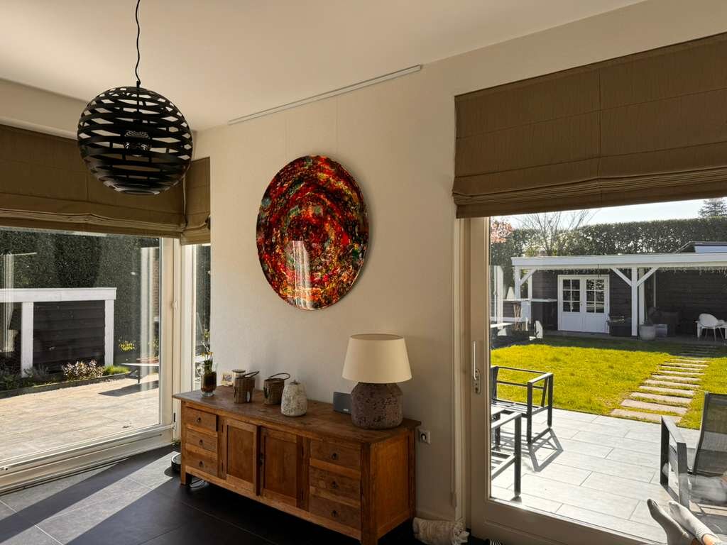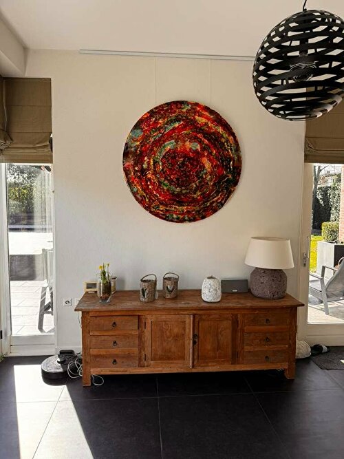 Dit ronde abstracte werk hing in onze gallery, tot zij binnenkwamen. Geen lange twijfel, geen eindeloos vergelijken alleen dat ene gevoel: dit klopt.